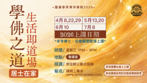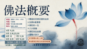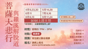 - 活動內容: 2026 靈巖春季佛學課程 菩薩大悲行與羅漢解脫道 課程內容: 四諦法, 七賢四聖, 菩堤心與發願, 四攝六度, 菩薩階位 日 期 / 4/09, 4/23, 4/30, 5/14, 5/28, 6/11, 7/09, 7/16, 8/06, 8/13, ...