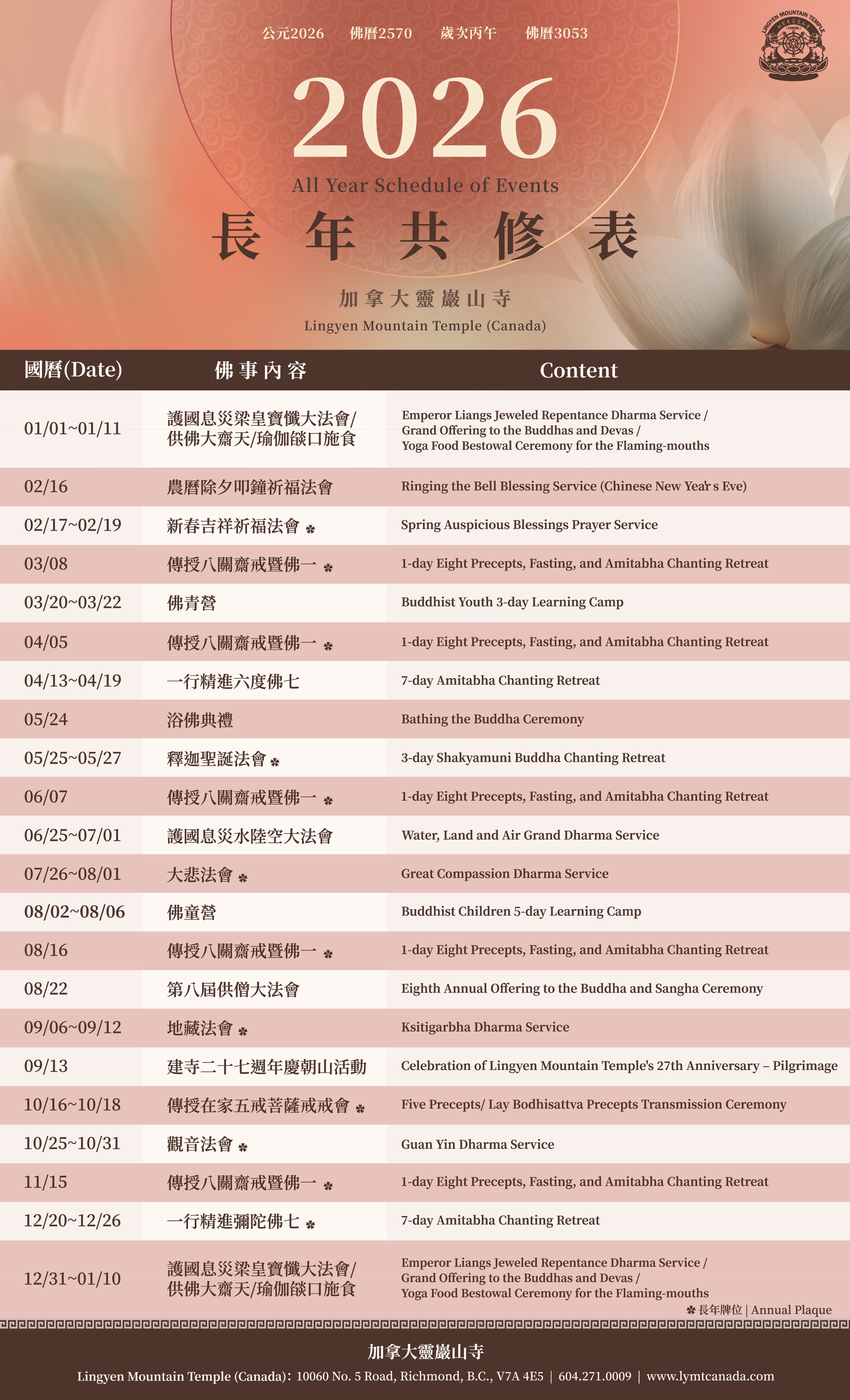 2026 加拿大靈巖山寺長年共修表