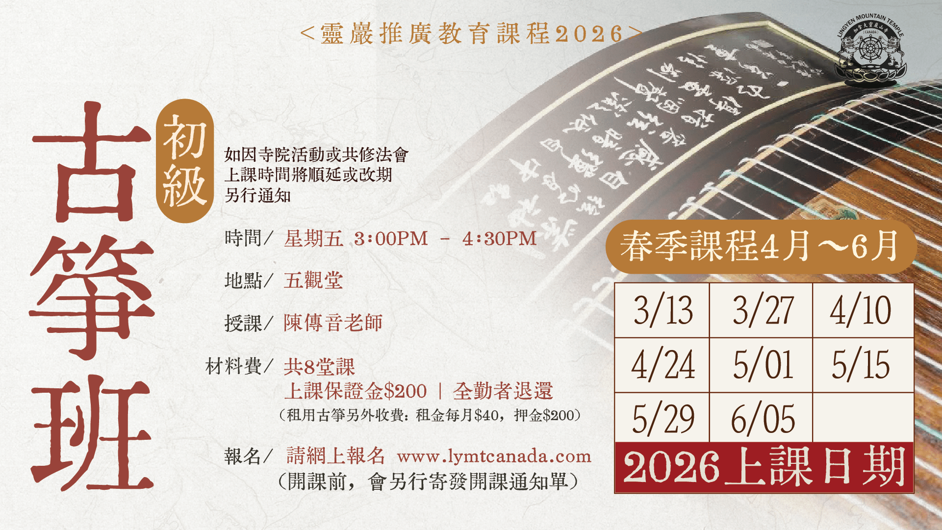 - 如因寺院活動或共修法會,上課時間將順延或改期,另行通知.