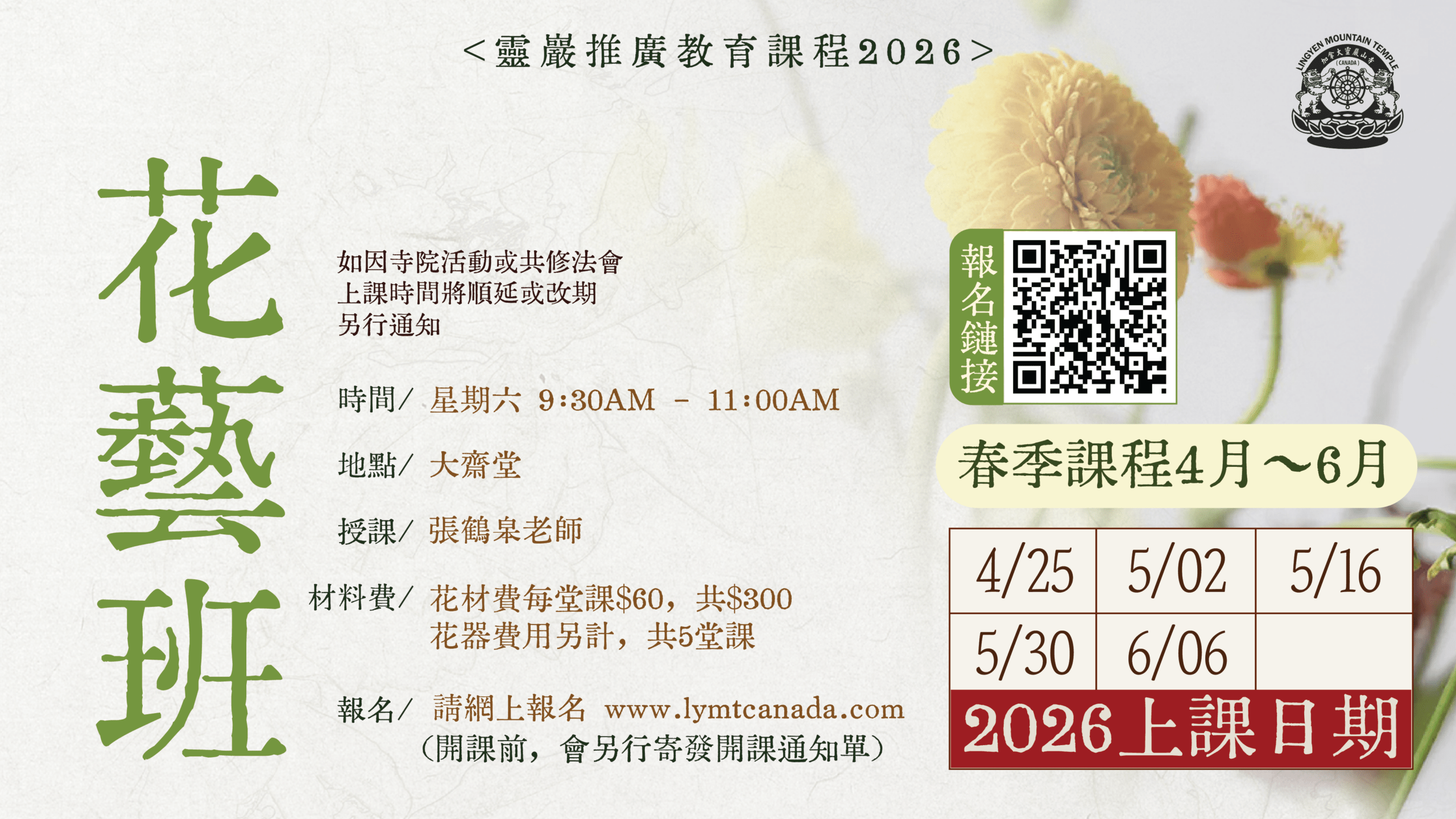 花器費用另計,共五堂課 報 名 / 前往報名- 如因寺院活動或共修法會,上課時間將順延或改期,另行通知.