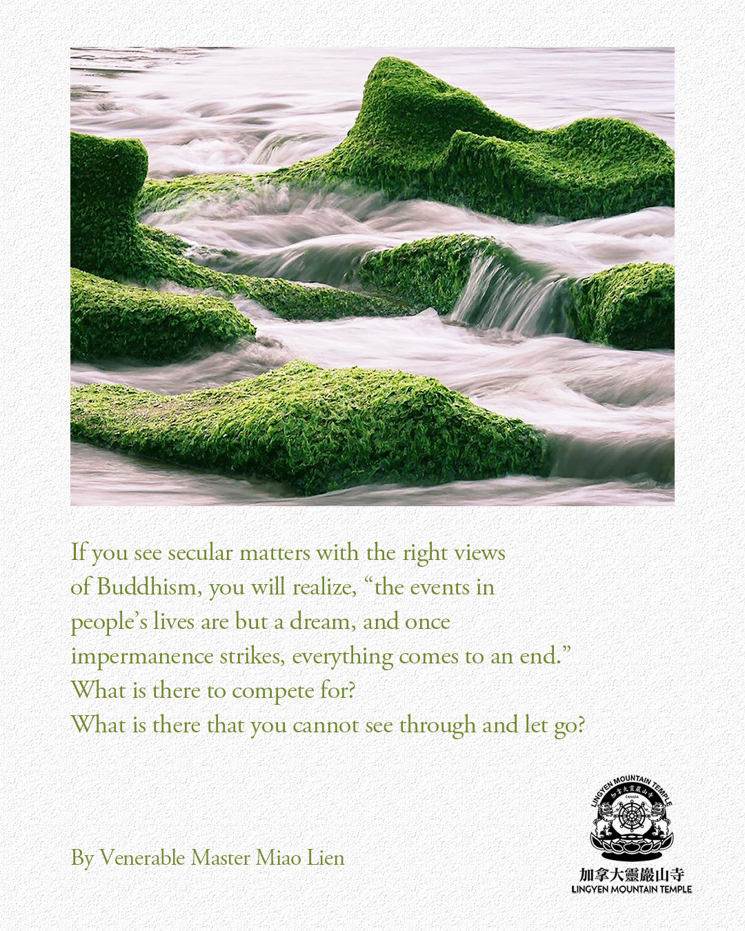 If you see secular matters with the right views of Buddhism, you will realize, “the events in people’s lives are but a dream, and once impermanence strikes, everything comes to an end.” What is there to compete for? What is there that you cannot see through and let go?