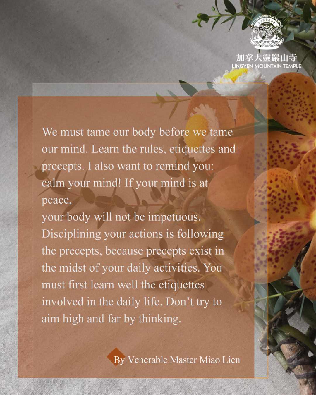 We must tame our body before we tame our mind. Learn the rules, etiquettes and precepts. I also want to remind you: calm your mind! If your mind is at peace, your body will not be impetuous. Disciplining your actions is following the precepts, because precepts exist in the midst of your daily activities. You must first learn well the etiquettes involved in the daily life. Don’t try to aim high and far by thinking.
