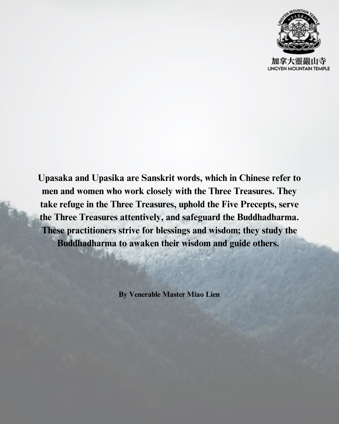 Upasaka and Upasika are Sanskrit words, which in Chinese refer to men and women who work closely with the Three Treasures. They take refuge in the Three Treasures, uphold the Five Precepts, serve the Three Treasures attentively, and safeguard the Buddhadharma. These practitioners strive for blessings and wisdom; they study the Buddhadharma to awaken their wisdom and guide others.