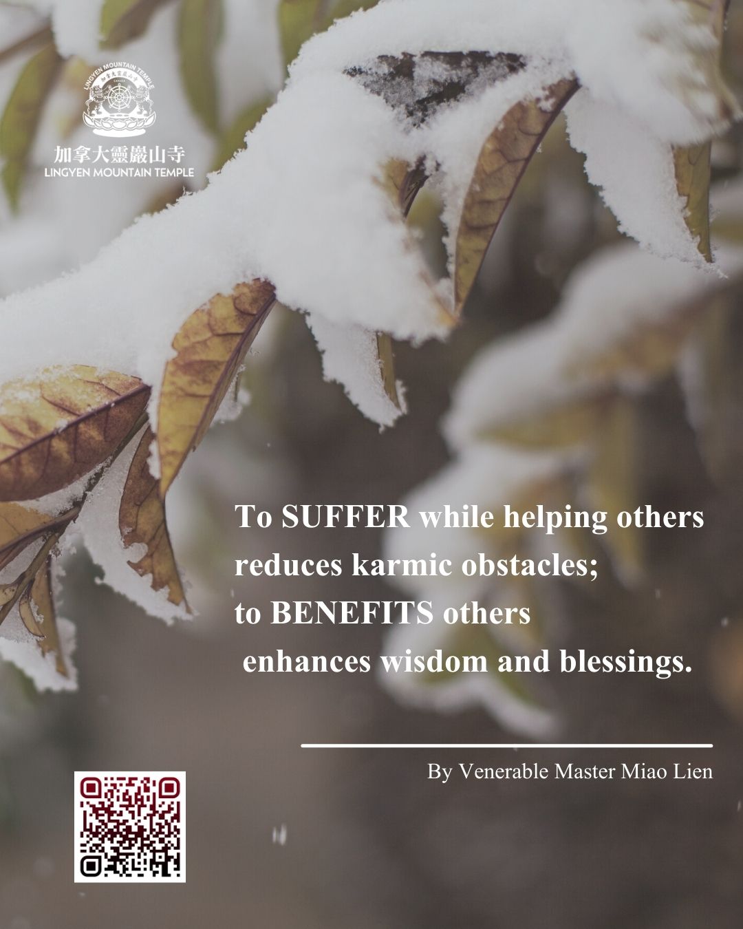 E00117 To suffer while helping others reduces karmic obstacles; to benefit others enhances wisdom and blessings.