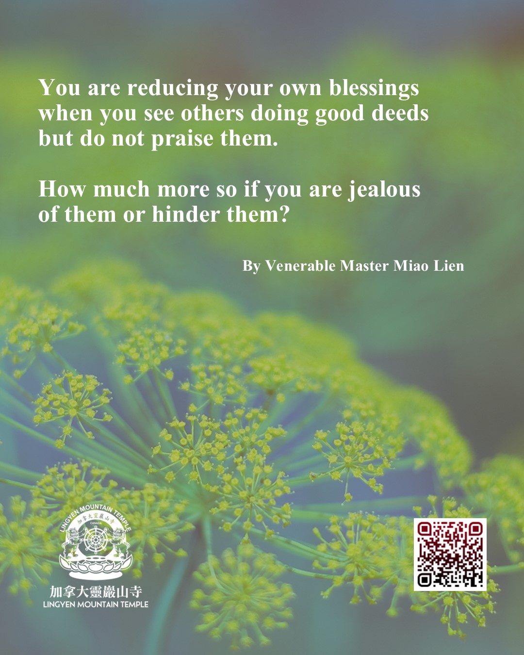 E00130 You are reducing your own blessings when you see others doing good deeds but do not p raise them. How much more so if you are jealous of them orhinder them?