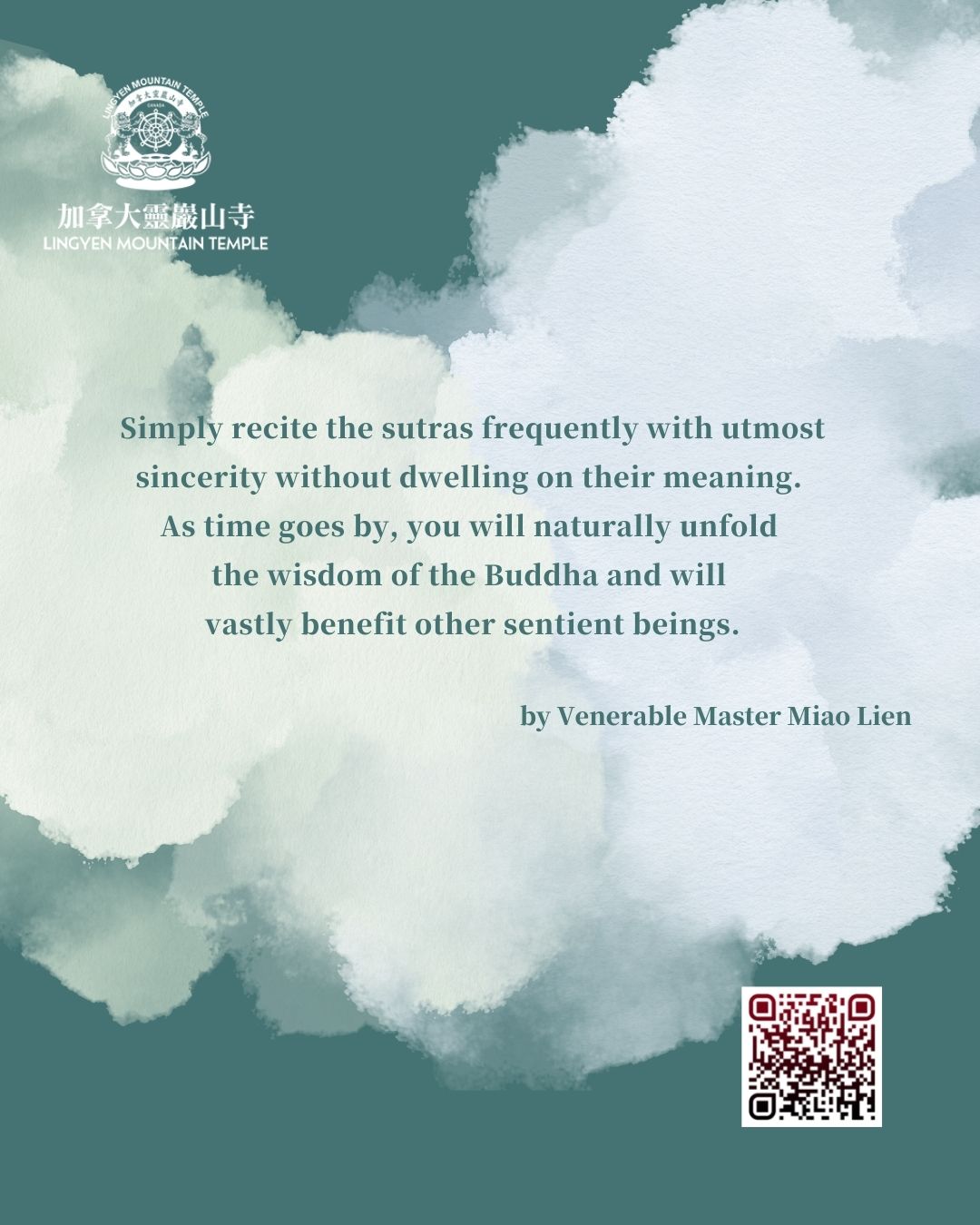 E00134 Simply recite the sutras frequently with utmost sincerity without dwelling on their meaning. As time goes by, you will naturally unfold the wisdom of the Buddha and will vastly benefit other sentient beings.